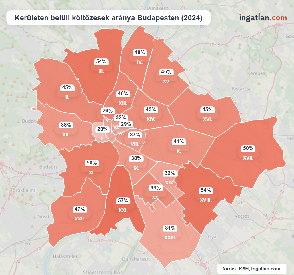 A kerületen belüli költözések aránya szintén érdekes képet mutat: a leghűségesebb lakosok a III. kerületben (53,7%) és a XVIII. kerületben (54,4%) élnek, ahol a többség lakóhelyet váltott, de nem hagyta el kerületét. Ezzel szemben az I. (20%) és V. kerületben (29,4%) élők jóval nagyobb arányban hagyták el lakókörnyezetüket. A portál szakértője szerint ez annak köszönhető Budapest két legdrágább kerületéről van szó. Az I. kerület árszintje tavaly és idén is nagyságrendileg 40 százalékkal, az V. kerületi lakásoké pedig 60 százalékkal haladja meg a budapesti átlagot.