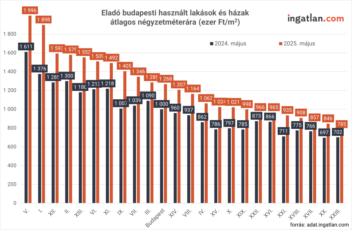 A 2025-ös lakásárrobbanás nem egyformán érintette az egyes kerületeket. Az ingatlan.com adatai alapján a legdrágább városrész tavaly és idén májusban is az V. kerület volt, ahol a használt lakások átlagos négyzetméterára 1,6 millió forintról 2 millió forintra emelkedett. A legmegfizethetőbb környék címét viszont a XXIII. kerület nyerte el a XX.-tól, így Budapest legolcsóbb városrészében eladó használt lakóingatlanok átlagos négyzetméterára tavaly még 693 ezer forint volt, jelenleg viszont már 803 ezer.