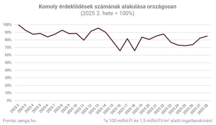 Az év elején tapasztalat ingatlanpiaci boom tavasz végére enyhülni látszott, a komoly érdeklődők száma az év elejéhez képest csökkent. A most bejelentett lakásvásárlási program azonban újabb lendületet hozott az ingatlanpiacra, bár az még nem érte el az év elejei szintet. Mint Futó Péter mondta, a 2025 második hetében mért csúcsnál még mindig kevesebb az érdeklődő, az elmúlt héten az akkori értékek 85%-át érte el a komoly érdeklődők száma.