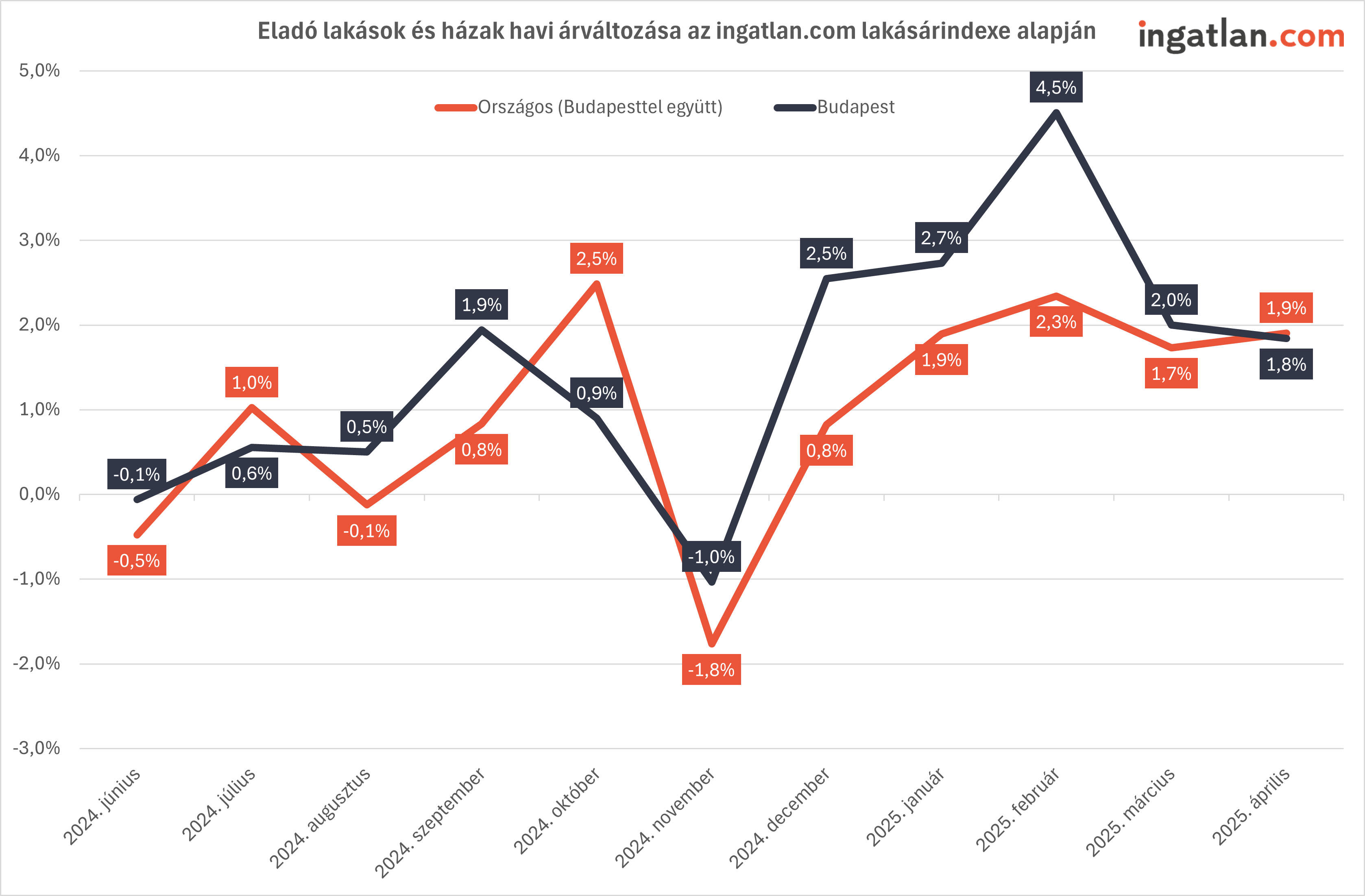 A budapesti lassulásra a havi adatok utalnak elsősorban. Országosan és a fővárosban is 2 százalék alatti drágulás jellemezte az áprilist, miközben Budapesten az idén 4 százalék feletti áremelkedésre is volt példa január és február között