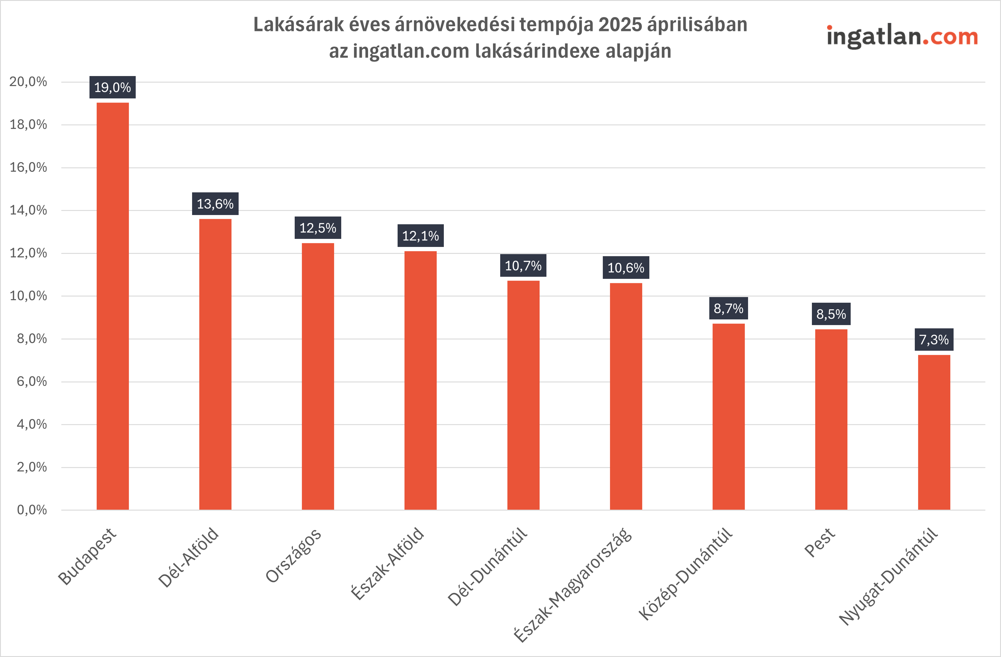 A lecsengő ingatlanbefektetői kereslettel párhuzamosan a lakásárak drágulása is lassult áprilisban Budapesten, de országos viszonylatban gyorsult a havi árnövekedési tempó az ingatlan.com lakásárindexe szerint. Éves szinten még mindig jelentős a drágulás, országos szinten 12,5 százalékos, Budapesten pedig 19 százalékos. Az éves áremelkedés ütemét nézve Budapest után a dél-alföldi és észak-alföldi régió következik a sorban, vagyis az ipari fejlesztésekkel érintett régiók.