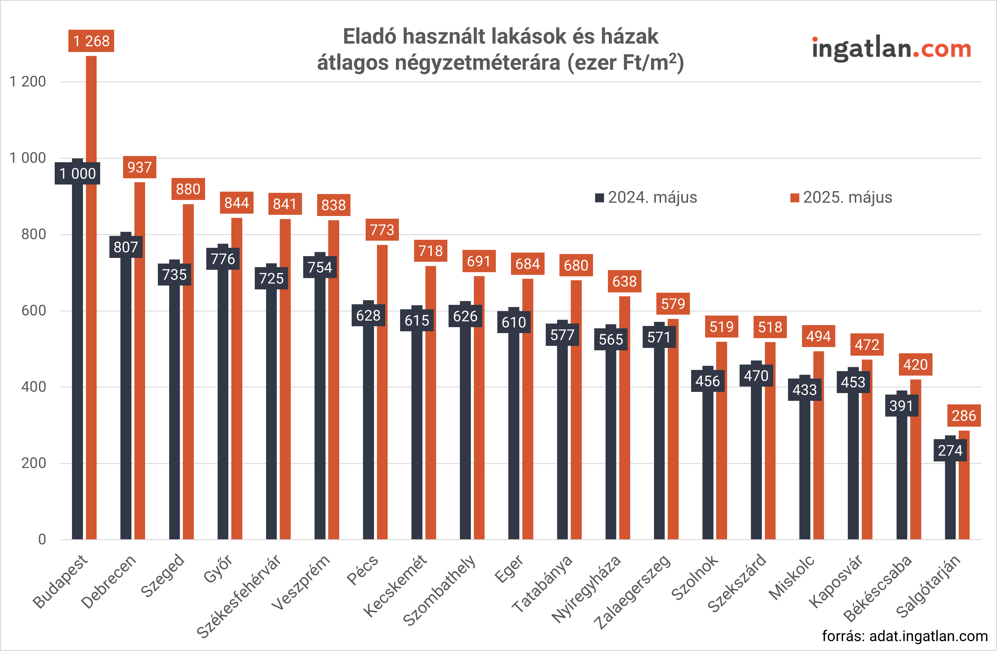 A többi nagyvárost tekintve Debrecenben 937 ezer, Szegeden pedig 880 ezer forint volt az átlagos négyzetméterár, így Szeged az elmúlt 2 évben a második legdrágább vármegyeszékhellyé lépett elő. Győrben 844 ezer, Pécsett 773 ezer, Miskolcon pedig 494 ezer forintot kértek a lakások négyzetméteréért. A legolcsóbb megyeszékhely továbbra is Salgótarján, ahol 2025 májusában mindössze 286 ezer forintba került átlagosan egy négyzetméternyi használt lakóingatlan.