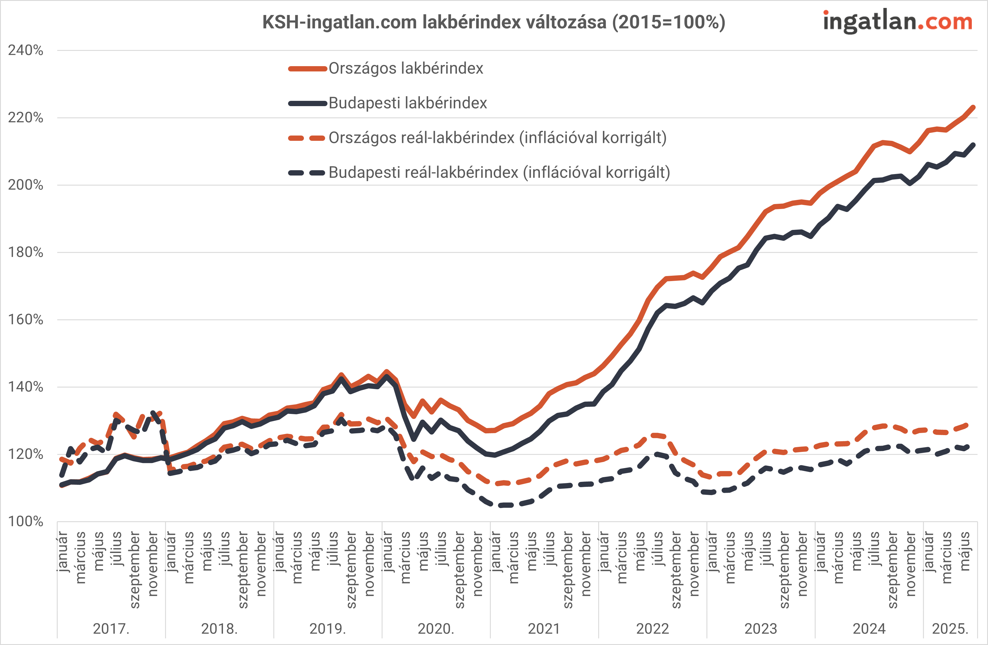 Országos szinten is megfigyelhető ugyanez a tendencia, mivel a jelenlegi éves drágulási ütem közel feleakkora, mint amit 2023 júniusában mutatott a KSH-ingatlan.com lakbérindexe.