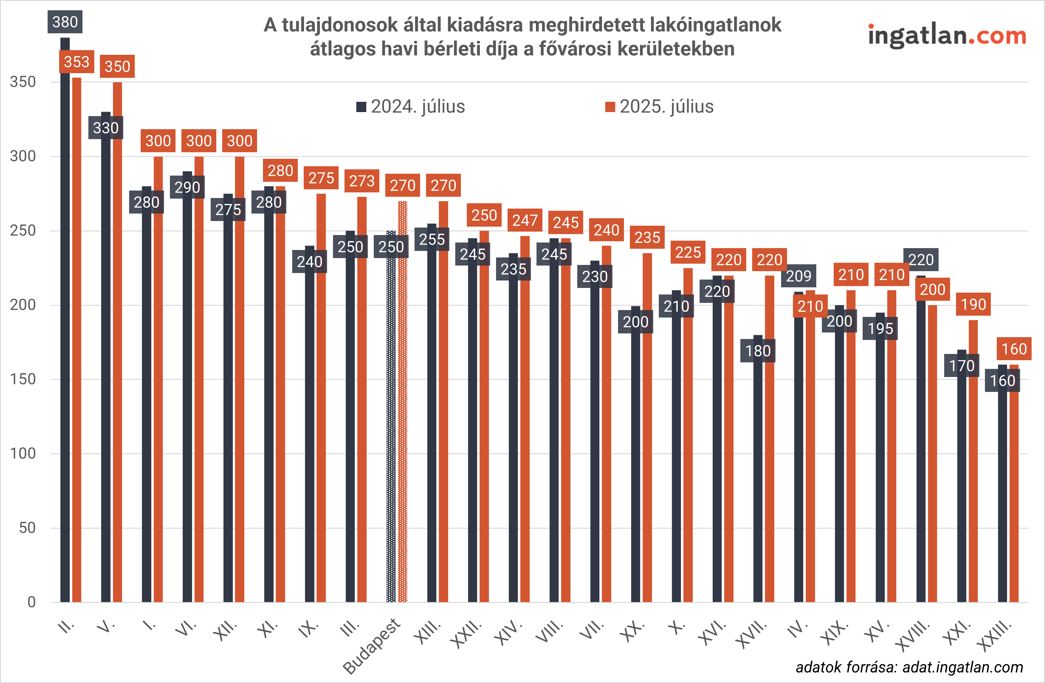 A legnagyobb kínálattal rendelkező XIII. és XI. kerületben 270 ezer és 280 ezer forint az átlagérték. A legolcsóbb fővárosi városrészek közé tartozik a XVIII., a XXI. és a XXIII. kerület, utóbbiakban 160-200 ezer forint az átlagos lakbér, ám a kínálat is viszonylag szűk.