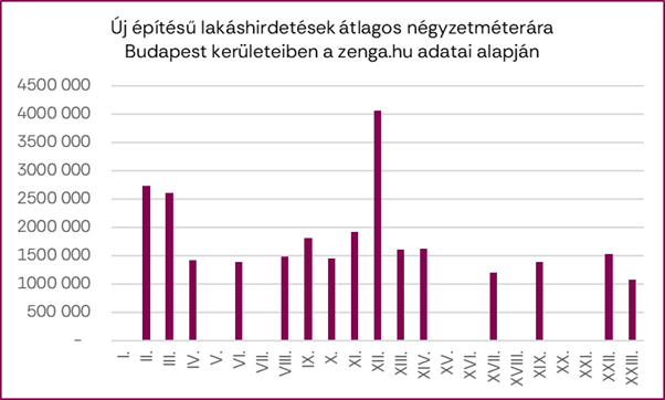 2025 tavaszán országszerte átlagosan 1,48 millió forintért hirdették meg a zenga.hu felületén az új építésű lakásokat, ám Budapesten közel 1,9 millió forintos négyzetméterár a jellemző. A fővárosban nagy a különbség kerületenként: a külső kerületekben akár 1,2 millió forintos négyzetméteráron is találni új ingatlanokat, míg a frekventált helyeken, vagy a budai kerületekben nem ritka a 2 millió forint feletti négyzetméterár. A piacon a legtöbb szabad, újépítésű lakás a 13. kerületben van, utána a 11., majd a 14. kerület következik. Szobaszám tekintetében jelenleg a 3 szobás kínálatból van a legtöbb.