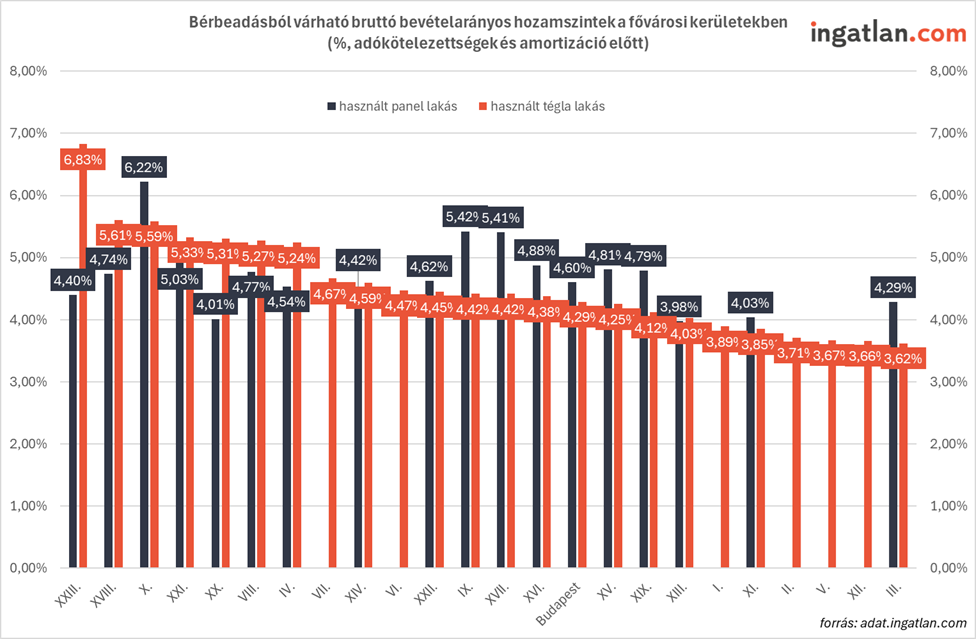 Befektetői szempontból izgalmas területté vált Budapest, annak ellenére, hogy a kiadási szempontból népszerű társasházi lakások bérbeadásból várható hozamai nem kiemelkedően magasak. A használt téglaépítésű lakások esetében 4,3 százalék, a panellakásoknál pedig 4,6 százalék a bruttó bevételarányos hozamszint, ami nem tartalmazza az amortizációt és az adókötelezettségeket