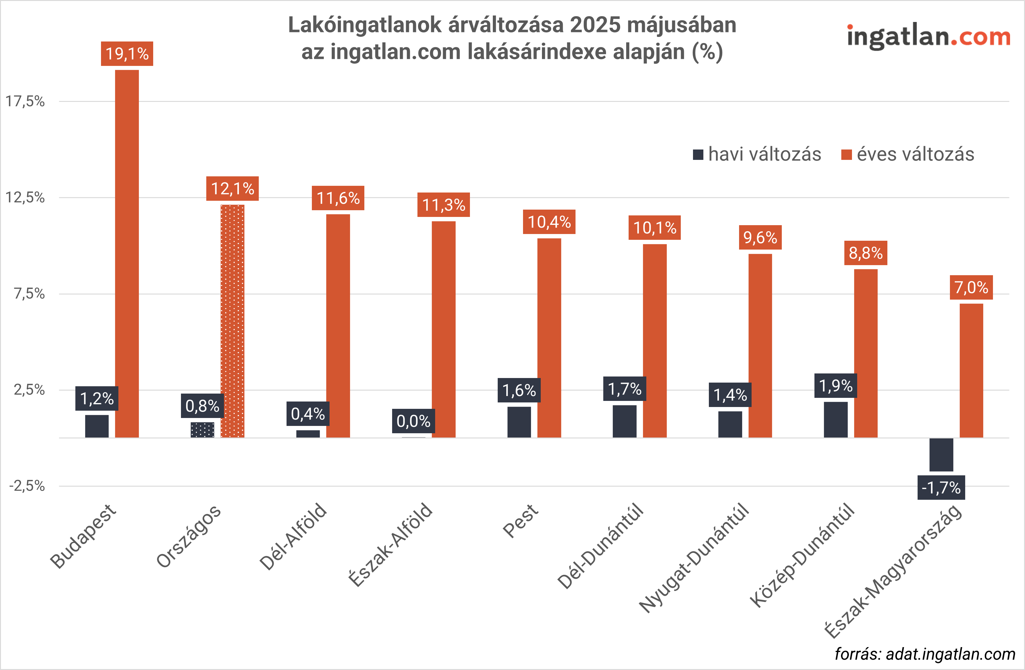 A lakáspiacot lassuló drágulás és jelentős regionális különbségek jellemezték májusban az ingatlan.com legfrissebb lakásárindexe szerint, amely lényegében azonnal valós időben mutatja a tényleges árváltozásokat. Ezt jelzi például, hogy egy hónappal ezelőtt, áprilisban az ingatlan.com lakásárindexe 19,2 százalékos éves áremelkedést mutatott ki Budapesten, ami tizedespontossággal egyezik a Magyar Nemzeti Bank (MNB) lakáspiaci jelentésében 2025 első negyedévére vonatkozó áremelkedési ütemmel.