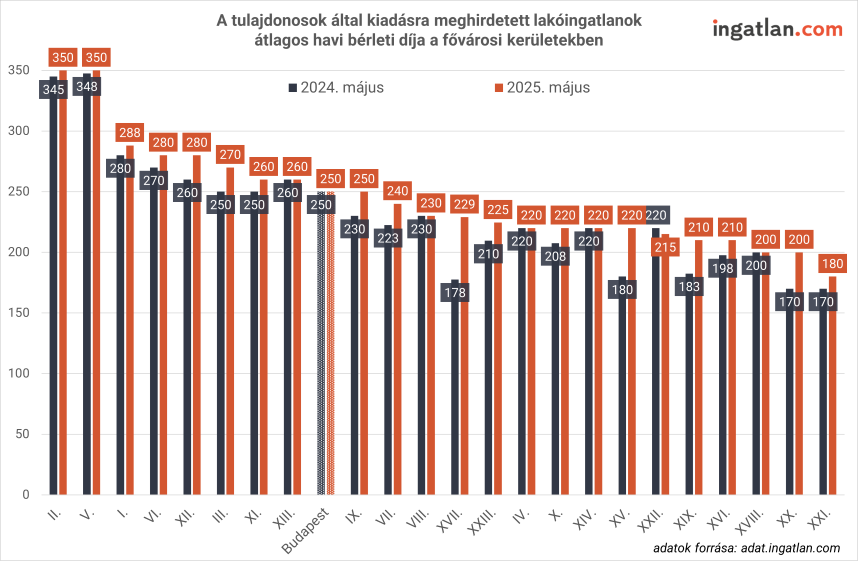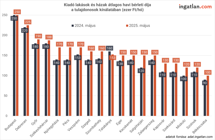 „Budapesten és Debrecenben a viszonylag magas albérletárak középértéke lényegében nem változott az előző évhez képest. A fővárosban 250 ezer, Debrecenben pedig 225 ezer forintos havi átlagos bérleti díj jellemzi a piacot. Ugyanakkor Szegeden, Pécsen és Győrben 10-30 ezer forinttal feljebb mentek a bérleti díjak, így ezekben az egyetemvárosokban 160-190 ezer forint az átlag. Miskolcon is drágulás következett be, így 120 ezer forintért kínálják a kiadó lakóingatlanokat, szemben a tavalyi 100 ezer forintos összeggel” - mondta a szakember.
