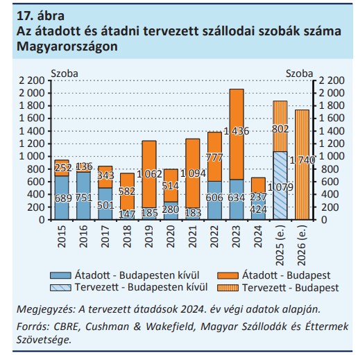2025-ben a budapesti iroda- és ipari-logisztikai piac kihasználatlansági rátájának emelkedése várható.A hitelintézetek 2024-ben, az alacsony bázist jelentő előző évhez képest 36 százalékkal több kereskedelmi ingatlannal fedezett projekthitelt folyósítottak.A turizmus bővülésével a szállodaszektor teljesítménymutatói javultak. 2024-ben mind a külföldi, mind a belföldi vendégéjszakák száma emelkedett.