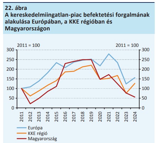 A piac ciklikus helyzetét tekintve az Royal Institution of Chartered Surveyors (RICS) felmérésének eredménye továbbra is magas bizonytalanságot tükröz: a 2025. januárban megkérdezett szakemberek fele még recessziót érzékelt, másik fele pedig már a piac kezdeti fellendülését.2024-ben a KKE régió több országával ellentétben Magyarországon éves összevetésben tovább csökkent a befektetési forgalom, és annak többsége hazai befektetőkhöz kötődött.