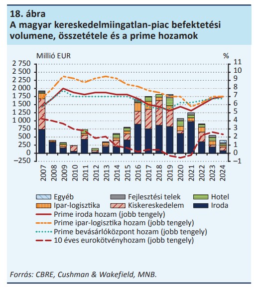 Az épülő irodaterületek esetében magas a tulajdonosi használatra épülő irodaházak aránya, de a költözések majd a meglévő állomány kihasználatlansági rátájának emelkedését eredményezik.2024-ben a hazai kereskedelmiingatlan-piac befektetési forgalma mintegy 400 millió eurót tett ki, ami 28 százalékkal elmarad a 2023-as alacsony forgalomtól. A KKE régió átlagában ugyanakkor már 69 százalékkal emelkedett a befektetési forgalom. Az elsődleges (legjobb elhelyezkedésű és minőségű ingatlanokra vonatkozó) irodahozam a második félévben már stagnált.