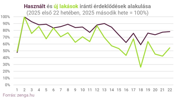 Az év első hónapjaihoz képest gyengébb kereslet jellemezte a tavasz második felét a lakáspiacon, és ez alól az újlakáspiac sem jelentett kivételt. Az év eddigi részében a zenga.hu keresési számai alapján január második hetében volt a legmagasabb a komoly érdeklődők száma, de áprilisra mind a használt, mind az új lakások esetében alábbhagyott a lendület, amelyben a csökkenő befektetői érdeklődés mellett a hirtelen megemelkedett árak is szerepet játszhattak
