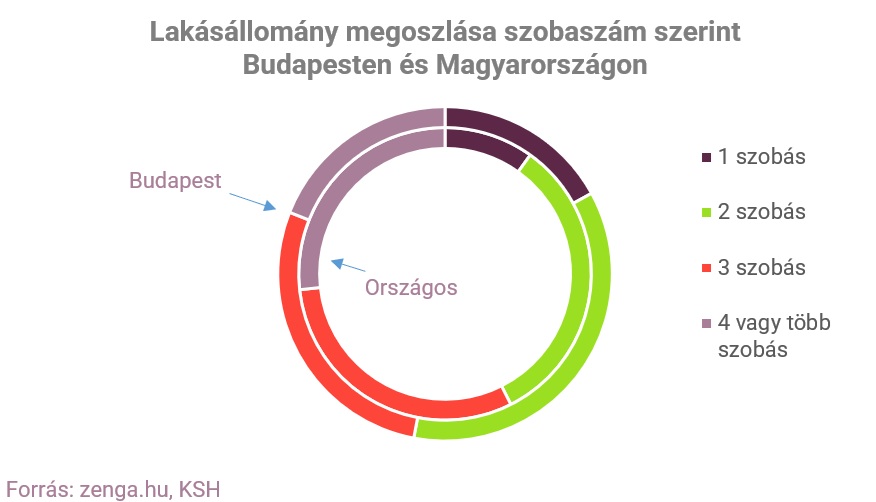 Ehhez hasonló arányt mutat a lakásállomány szobaszám szerinti megoszlása is, ahol a KSH szerint országosan és Budapesten is kétszobás lakásból van a legtöbb, de Budapesten magasabb ennek aránya. Míg az országban bő 40 százalék, addig a fővárosban 50 százalék felett van az egy és kétszobás lakások együttes aránya