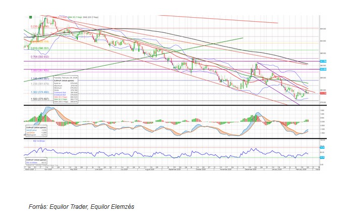 A 378,50-es támaszhoz ért a jegyzés, melyre a következő napokban is kiemelten érdemes figyelni. Felül 380-nál, majd 380,53-nál húzódnak fontosabb ellenállási szintek, utóbbi a 30 napos mozgóátlag. A Bollinger-szalagok beszűkülése arra utal, hogy hamarosan nagyobb, trendszerű elmozdulás indulhat, az indikátorok enyhén felfelé mutatnak jelenleg.