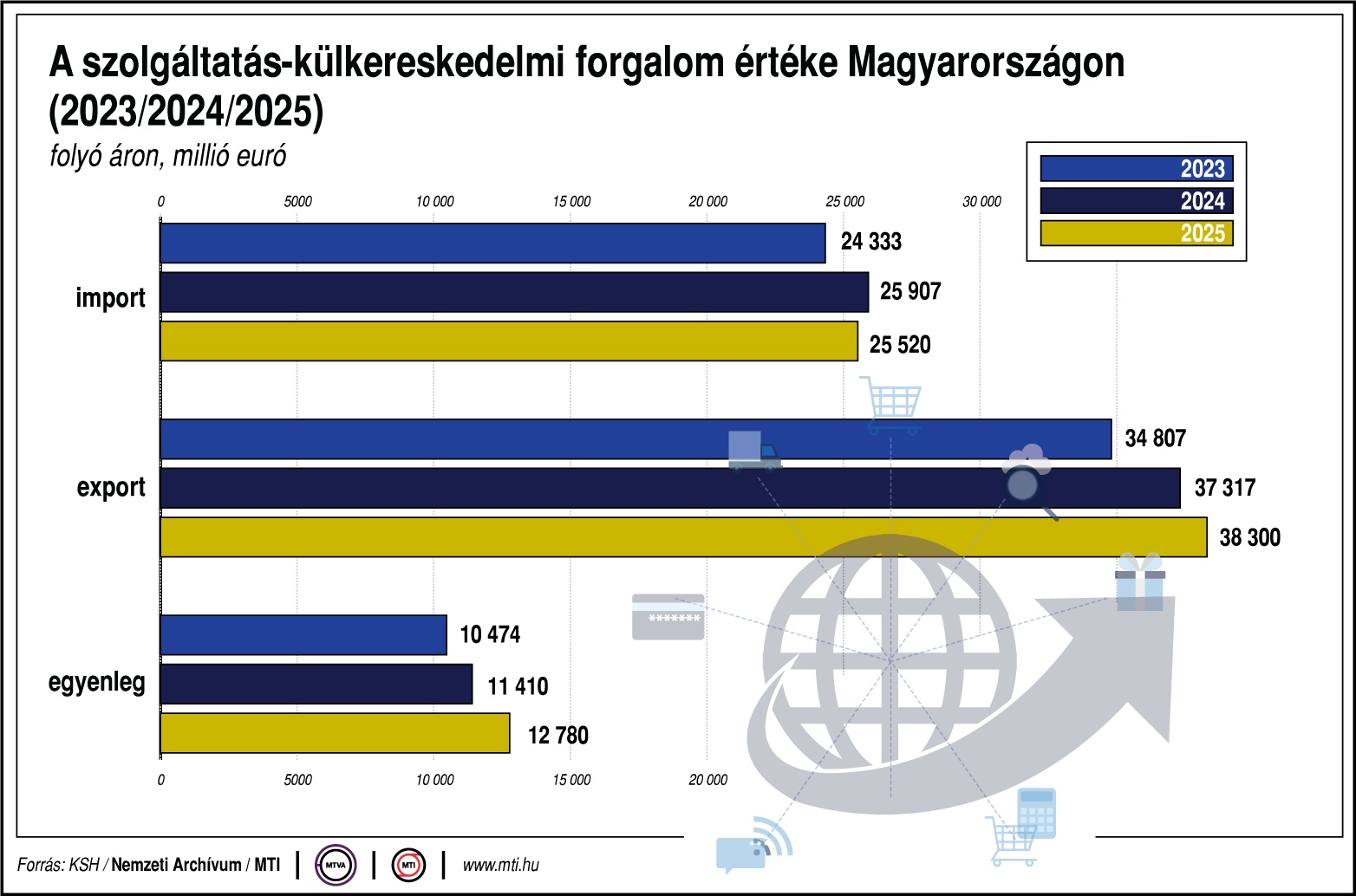 - negyedik negyedévében az export értéke 10 milliárd euró (3,9 ezer milliárd forint), az importé 6,9 milliárd euró (2,7 ezer milliárd forint) volt. A szolgáltatás-külkereskedelem aktívuma 3,1 milliárd eurót (1,2 ezer milliárd forintot) tett ki.