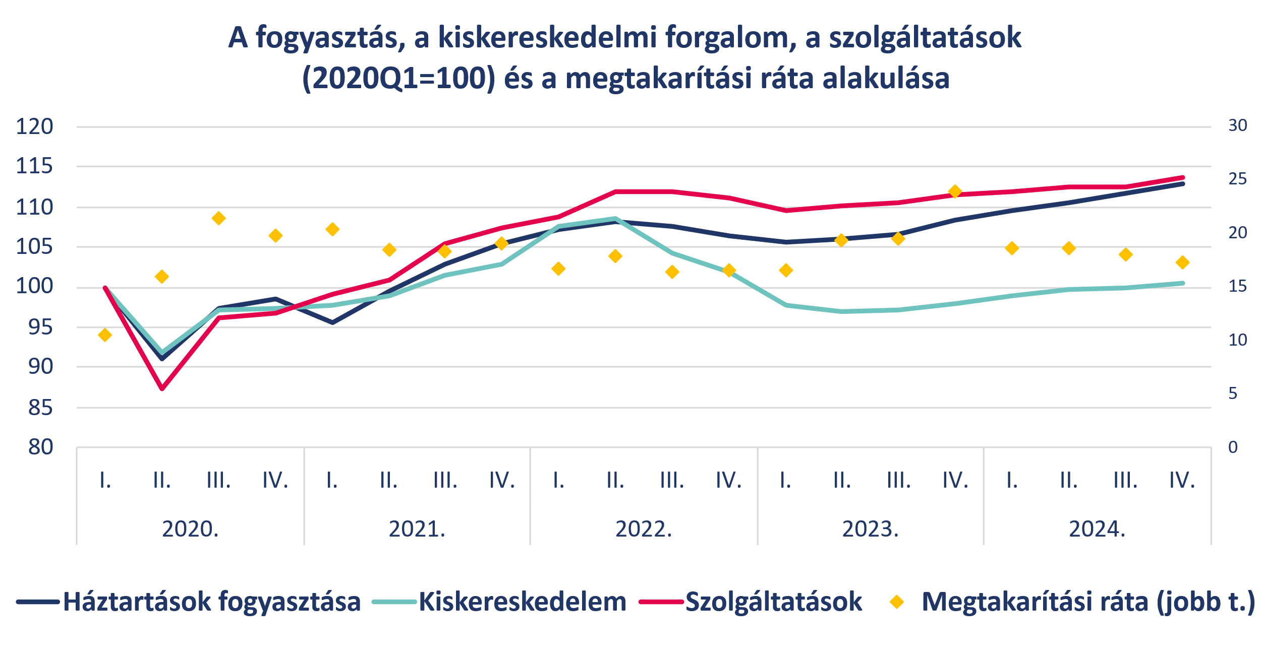 Felmerül a kérdés, hogy a megszerzett többletjövedelem hol jelenik meg? Egyrészt a covid és az inflációs sokk óta a magyar háztartások megtakarítási rátája historikusan magasnak tekinthető, és 2024-ben ez csak kis mértékben csökkent. Másrészt jelentős változás történt a háztartások fogyasztási szerkezetében: az inflációs sokk idején – 2022 második félévétől kezdve – a kiskereskedelmi fogyasztás jelentősen zuhant, és ezzel elvált a szolgáltatások fogyasztásának alakulásától, ami ezzel szemben csak kismértékben csökkent ugyanettől az időhorizonttól kezdődően, majd 2023-től, ha nem is érte el a korábbi növekedési ütemét, de enyhén növekvő pályára állt.