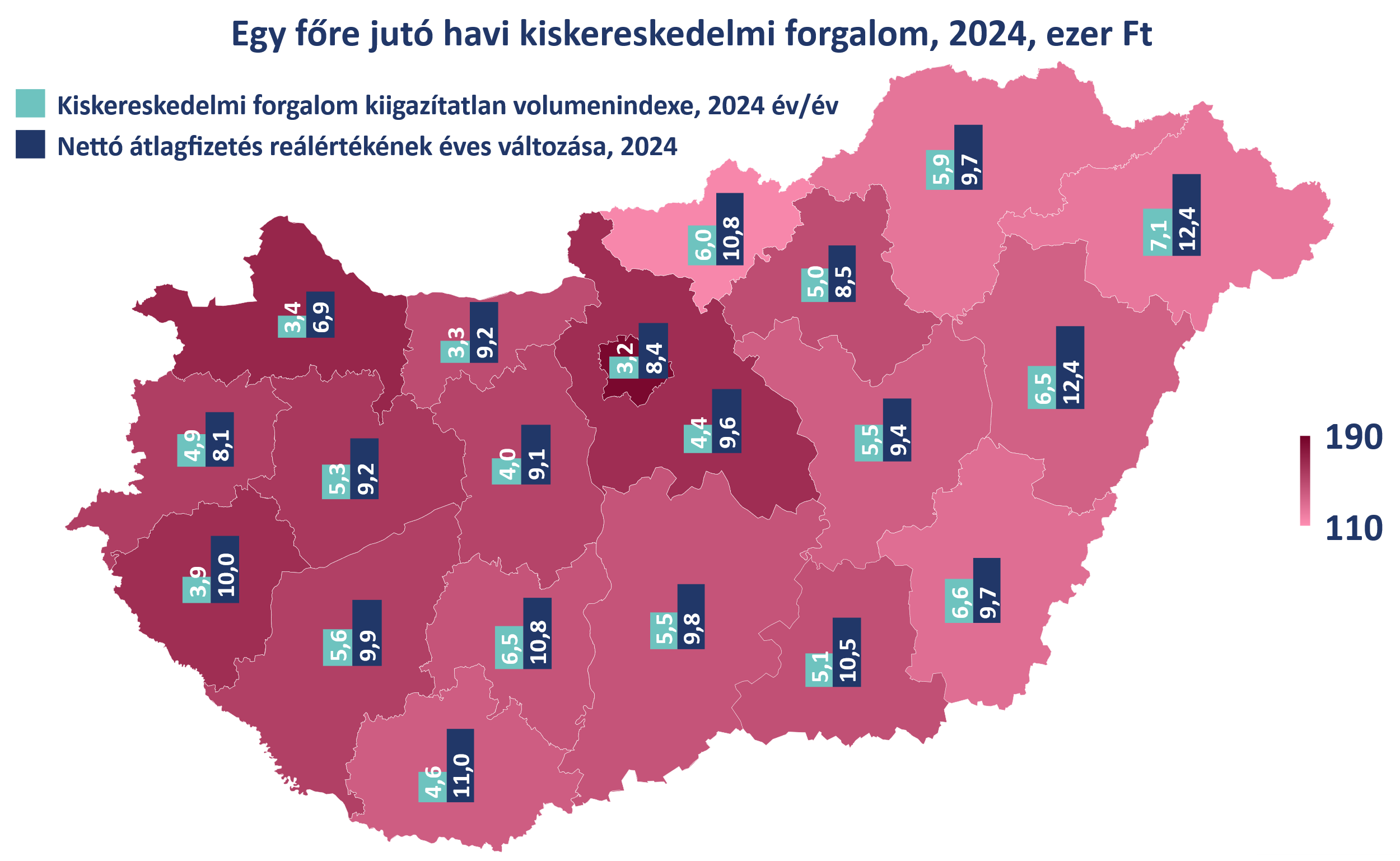 Általánosságban elmondhatjuk, hogy minél magasabb a nettó kereset, annál kisebb hányadát költjük el a kiskereskedelemben. Ezt alátámasztják a régiós adatok is, de vannak persze eltérések, például Zala és Somogy megye, ahol az átlagfizetés 47% és 44%-át költik el a kiskereskedelemben (a két legmagasabb érték), míg a nagyjából azonos átlagfizetéssel rendelkező Jász-Nagykun-Szolnok megyében ez csak 39%. Ennek egyik oka a turizmus, vagyis a balatoni üdülővárosokban történő költések zömmel itt jelenek meg, miközben az átlagfizetések relatíve alacsonyak. Ezt figyelembe véve is elmondható, hogy az országot az egy főre jutó kiskereskedelmi forgalom szempontjából is jellemzi egy kelet-nyugat irányú megosztottság (az alábbi ábrán jobbról balra haladva sötétedik a térkép). Azt is látjuk, hogy a fizetések vásárlóerejének növekedése tavaly minden megyében meghaladta a boltok forgalmának növekedését, sőt, van ahol többszörösen. Jellemzően ott volt nagy a növekedési ütemek közötti különbség, ahol eleve nagy az egy főre jutó kiskereskedelmi forgalom, vagyis a Dunántúl térségében.