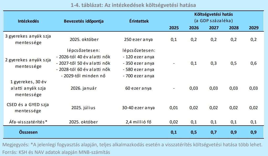 Ezen kívül ez év júliusától a CSED-re és a GYED-re is személyi jövedelemadó mentesség kerül bevezetésre. Idén október 1-től az 5 százaléknál magasabb áfakulcssal rendelkező zöldségek, gyümölcsök és egyes tejtermékek vásárlása után a nyugdíjasoknak az általános forgalmi adó összegét visszatérítik egy bizonyos összeghatárig. A jegybank becslése szerint az újonnan bevezetett intézkedések 2025-ben a GDP 0,1 százalékának, 2026-ban 0,5 százalékának, 2027-ben 0,7 százalékának megfelelő többletforrást hagyhatnak a családoknál és a nyugdíjasoknál.A teljes költségvetési hatás a két gyermekes anyák kedvezményének fokozatos bővítése mellett 2029-re jelentkezhet.
