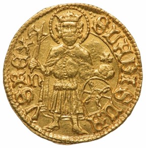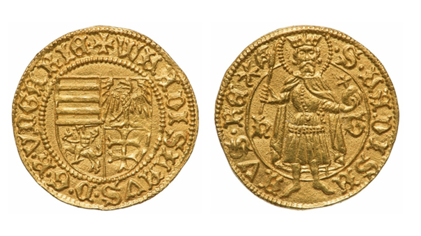 A Pénzmúzeum állandó kiállításában megtekinthető korai aranyforintján a négyelt címerpajzson a magyar vágások mellett a brandenburgi sas látható, utalva a király brandenburgi választófejedelmi címére. A hátoldalon Szent László király alakja tűnik fel, kezében attribútumával, a bárddal, amely a katonai erényeket idézi meg.Az érmén Franciscus Bernardi kamaraispán jegye látható.
