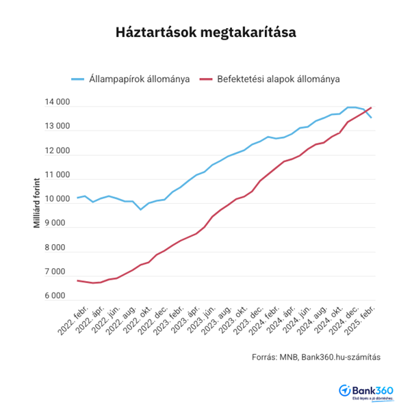 Ezzel a háztartások befektetési alapokban lévő megtakarítása 13 941 milliárd forintra nőtt, és hat év után először ismét meghaladta az állampapírokban lévő értéket. A februári 500 milliárd forintos kamateső tehát jelentős részben az alapok piacára került - hívja fel a figyelmet Herman Bernadett, a Bank360.hu szakértője.