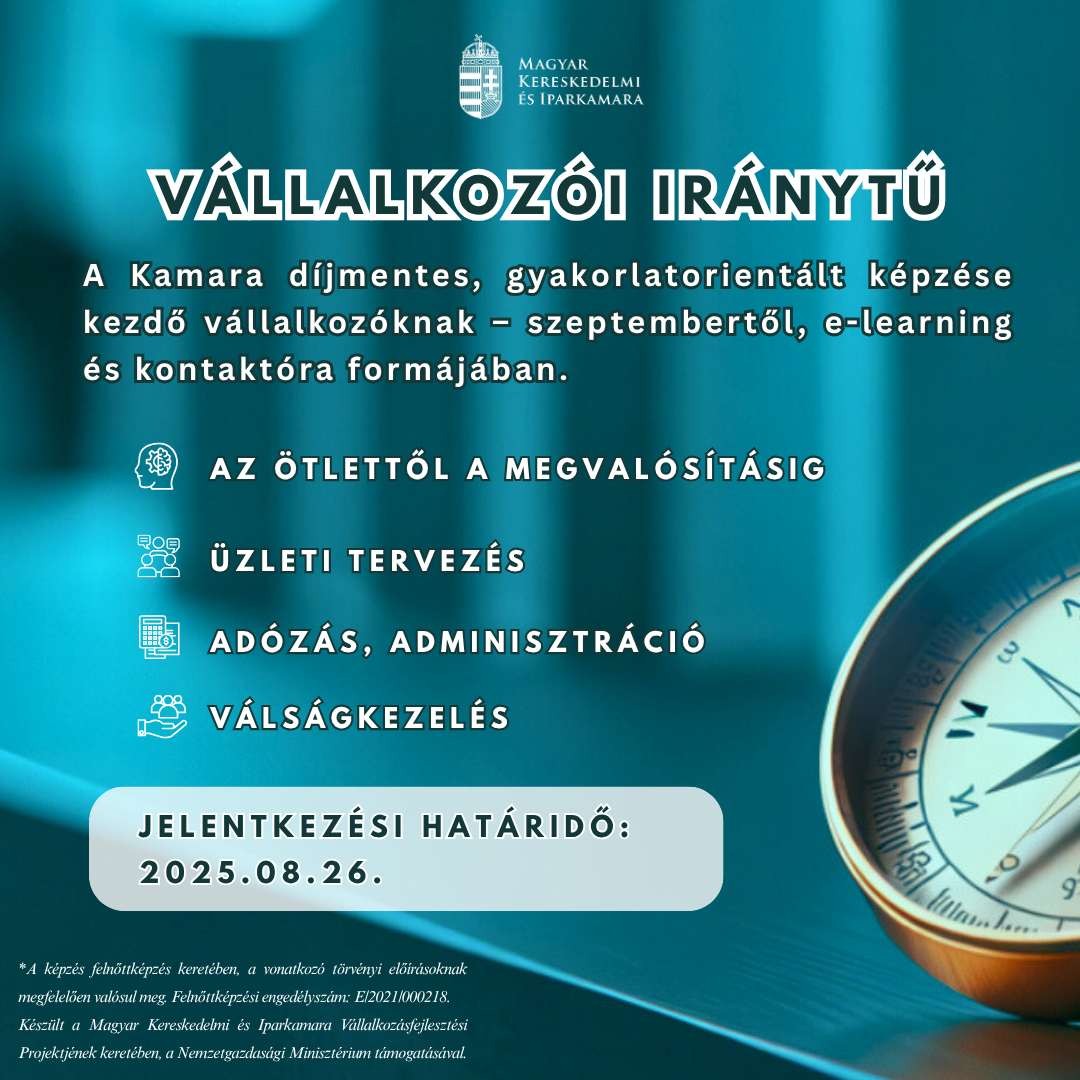 VállalkozásA Magyar Kereskedelmi és Iparkamara (MKIK) a területi kamarák közreműködésével új, térítésmentes képzést indít vállalkozást tervezők és már működő cégek vezetői számára. A „Vállalkozói Iránytű” elnevezésű program célja, hogy gyakorlati, azonnal alkalmazható tudást nyújtson a résztvevőknek pénzügyi, adminisztratív és stratégiai kérdésekben. Jelentkezni 2025. augusztus 26-ig lehet a résztvevő vármegyei és városi kamarák honlapjain keresztül - olvasható a közleményükben.